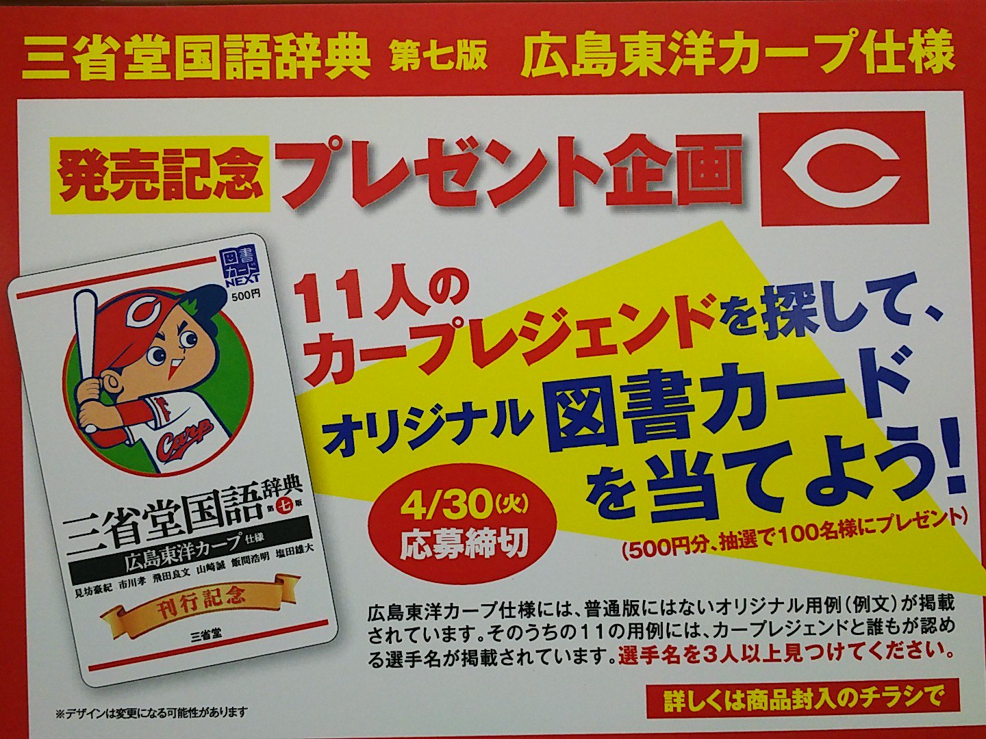 ট ইট র ジュンク堂書店 三宮駅前店 語学 カープファンの皆様お待たせしました 三省堂国語辞典カープ仕様発売中 みんな大好きカープ坊やが目印 発売記念として図書カードプレゼント企画もありますよ 三国 カープ Carp 辞書は三省堂 ジュンク堂書店